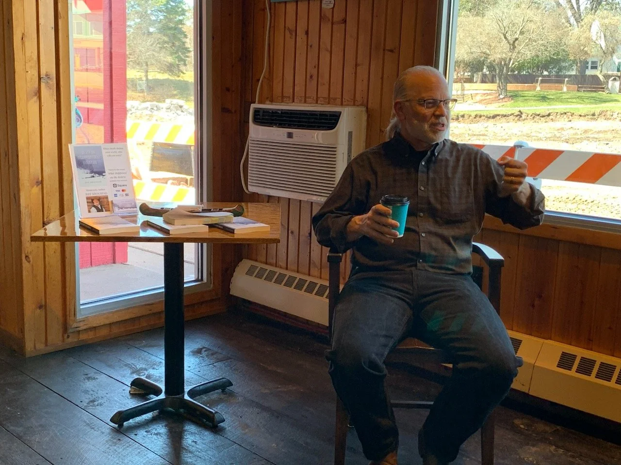 Melissa did a great job coordinating this event. Here she is introducing me at my book talk at Coco’s Cafe on Saturday. You can see the road construction barriers right outside the window!
